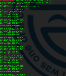 now lets take out a few ips to be excluded from the scan type nmap 127.0.0.* --exclude 127.0.0.1,127.0.0.2